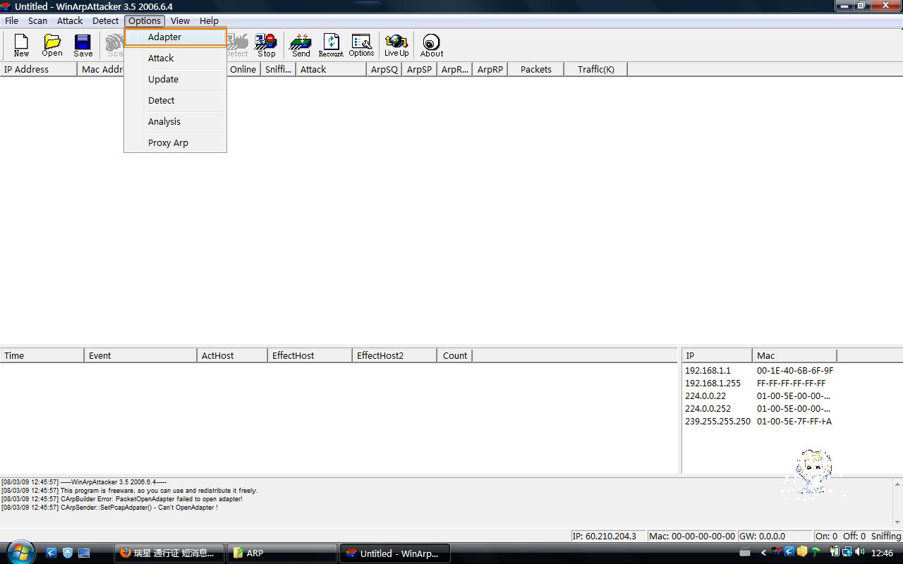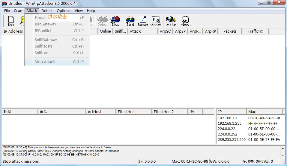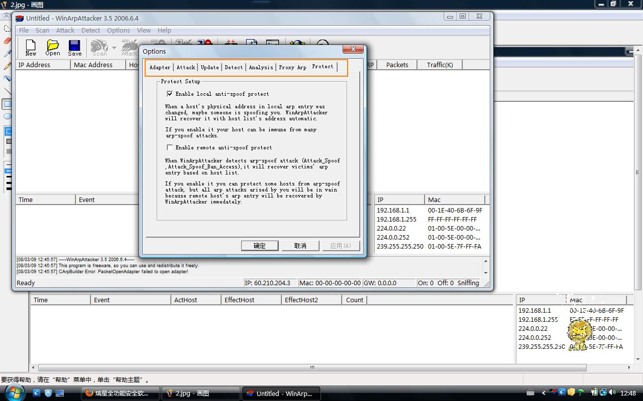 由于工作环境的改变(没有局域网,只有adsl,可以自己攻击自己嘛!!!再就是系统重装后,攻击软件无法获取网卡地址),无法演示ARP攻击!!!在此将攻击过程说一下,希望对防火墙的改进能有所帮助!!!