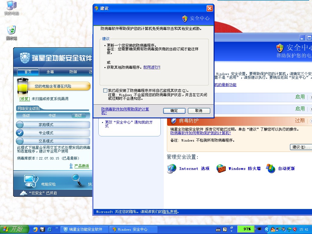 我几时把软件更新了,但是系统的安全中心提示,杀毒软件过期。如下图: