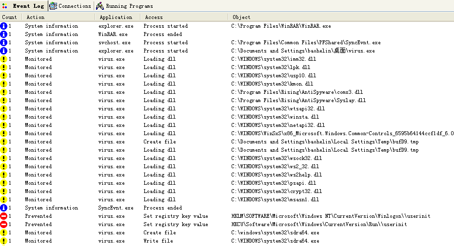 到这步(下图最后一行),RIS2010网络监控报警,拦截后,结束病毒进程。OK!没有重启。