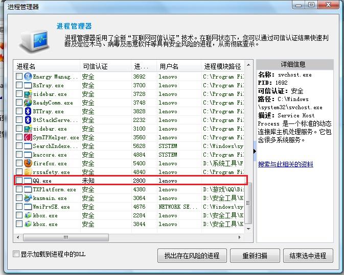 用金山的进程管理器查看QQ进程