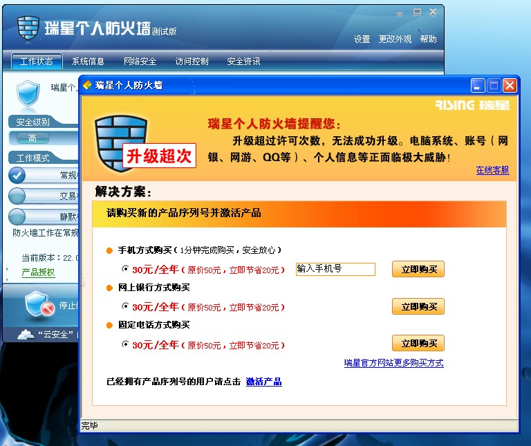 我是瑞星2010暴力公测第一阶段申请的测试序列号。现在不能正常升级,提示升级超次,