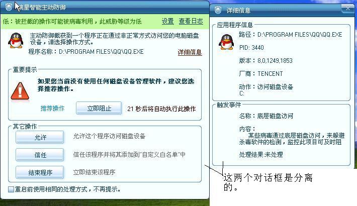 建议把主动防御的对话框和详细信息的对话框合并到一起,并采用折叠弹出的方式。这样只要主动防御在一次弹出对话框就不用再点击详细信息的按钮了。(就像安铁诺的显示方式)。