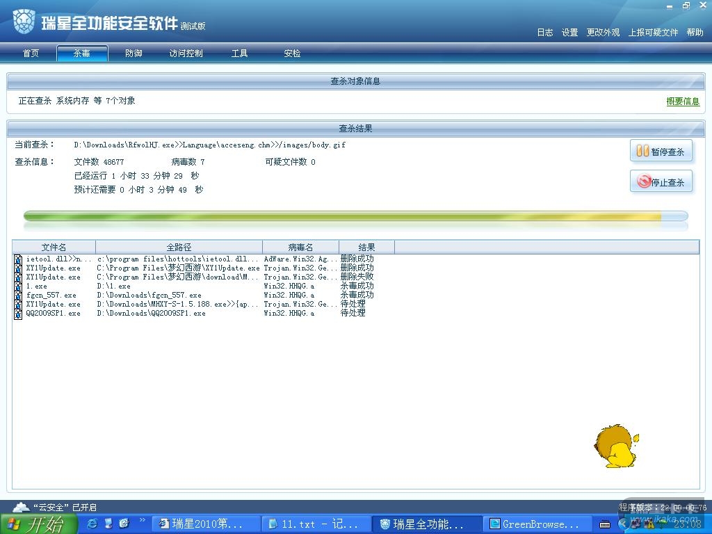 可是瑞星全功能安全软件2010到了最后图示有三分多钟杀完病毒时,时间却没有缩短,反而剩佘的时间变多了。提示结束时间不