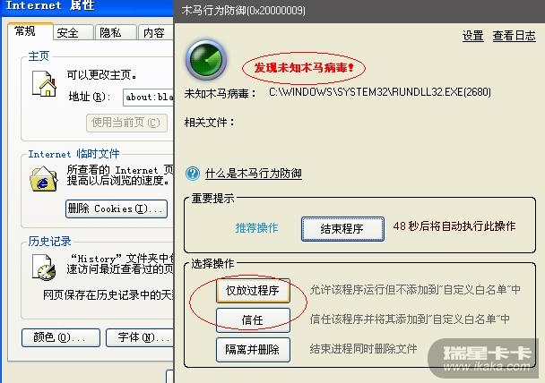 问题现象:打开IE属性——删除文件——确定后就弹出发现木马病毒,点击“信任”后仍会重现。