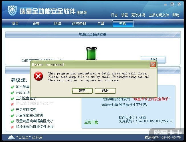 打开瑞星主界面,点击设置,也没有设置什么选项,只是一个个看了一下,确定后,瑞星报错。