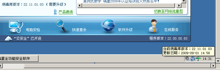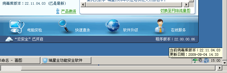 小结:卡巴斯基、瑞星2010全功能版两个软件在升级过程中,前者相对来说占用系统资源较高,当时电脑用起来一顿一顿的。