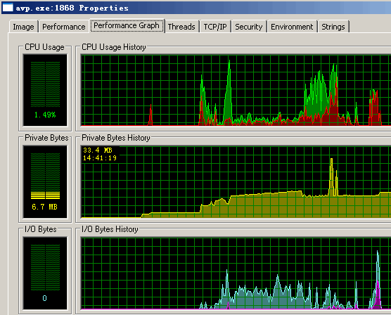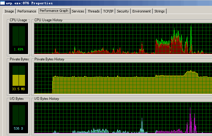 卡巴斯基升级过程中无论是下载文件还是更新,进程名都是avp.exe,只不过命令行参数不同,相应进程的资源占用情况如下: