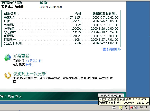 杀毒软件准备:将瑞星全功能10与卡巴斯基全功能10均升级到最新版本,然后取消软件的自动升级功能。