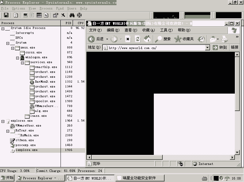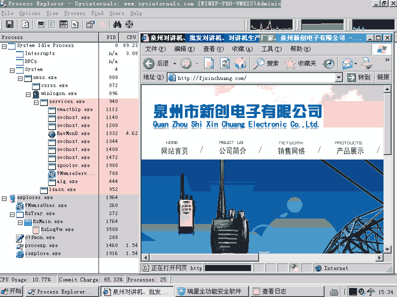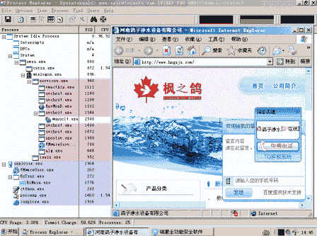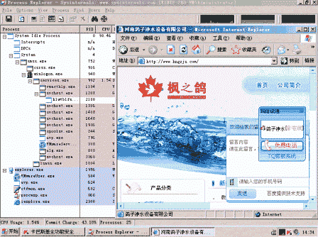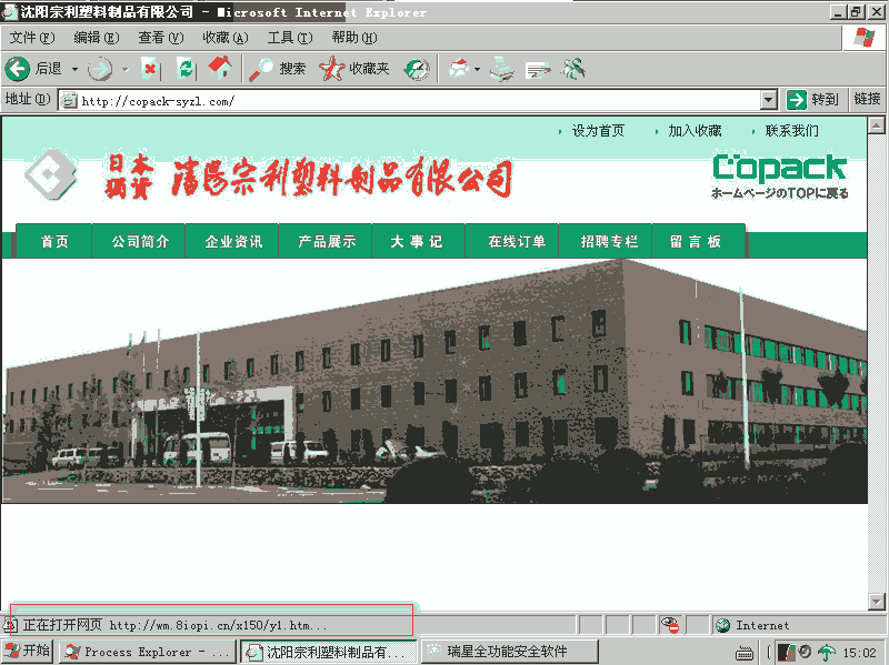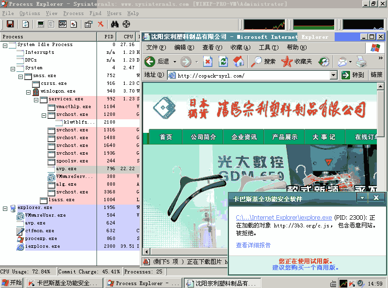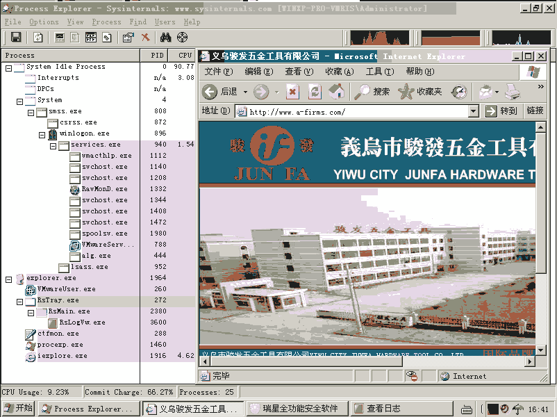 网页打开得非常缓慢;杀毒软件检测到威胁并拦截;从进程列表中可以看到IE启动了一个cmd.exe的子进程,根据当前的网马的特点,通常是利用DOS命令结束安全软件,禁用安全相关的服务等一些动作;CPU及内存占用比较高,几乎到了无响应的程度。7、http://www.a-firms.com(义乌骏发五金工具有限公司)