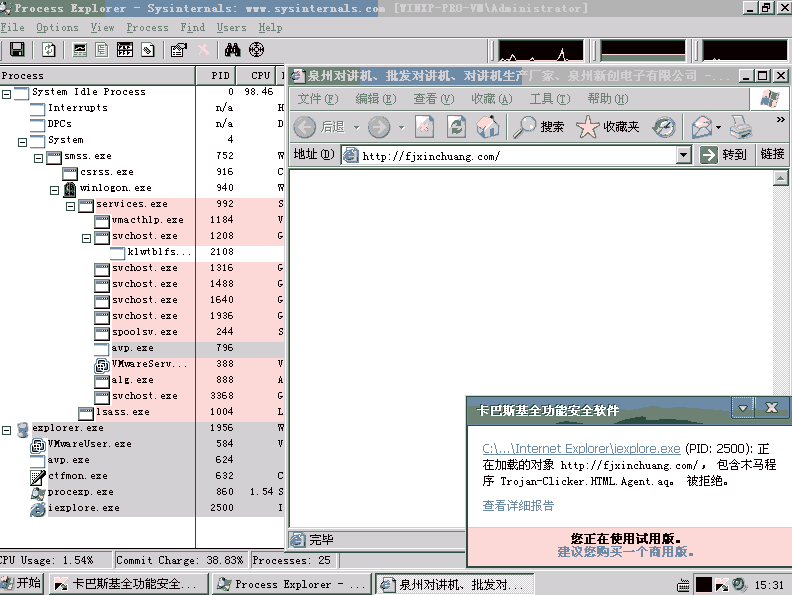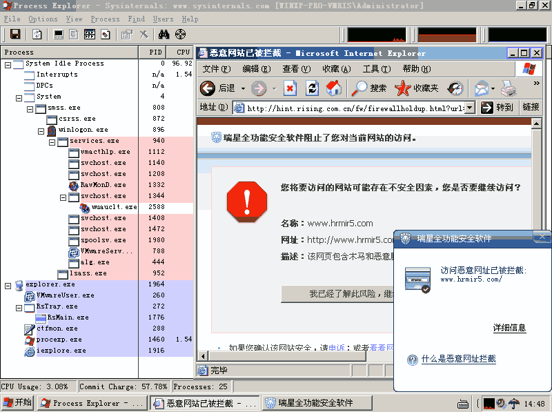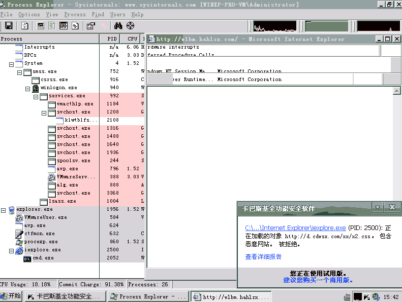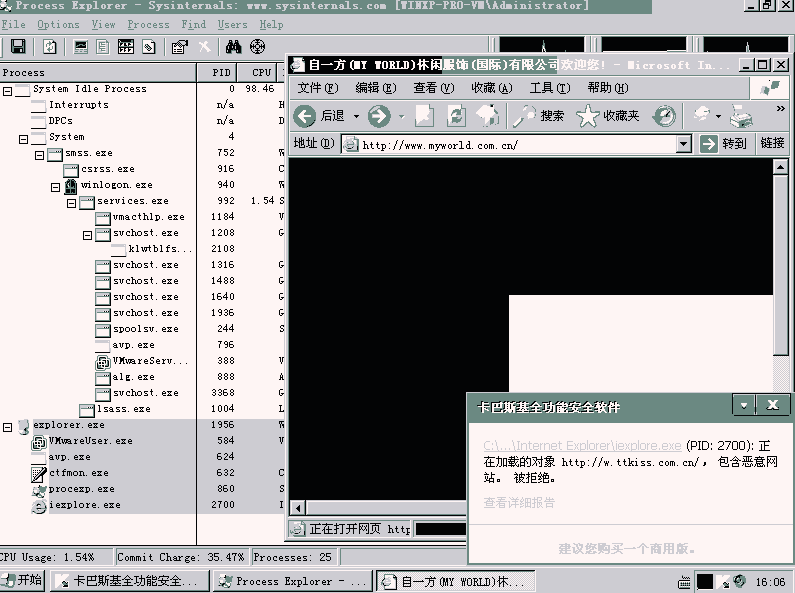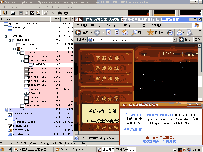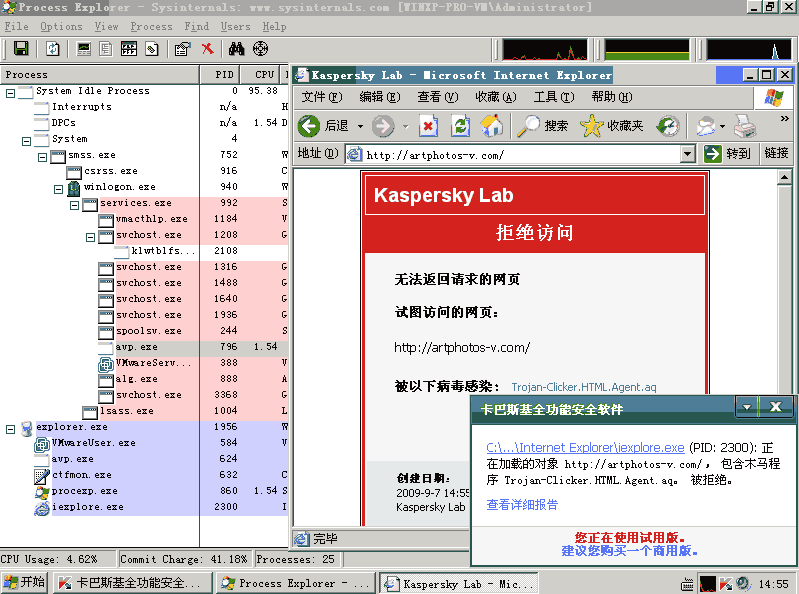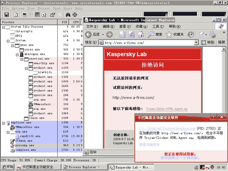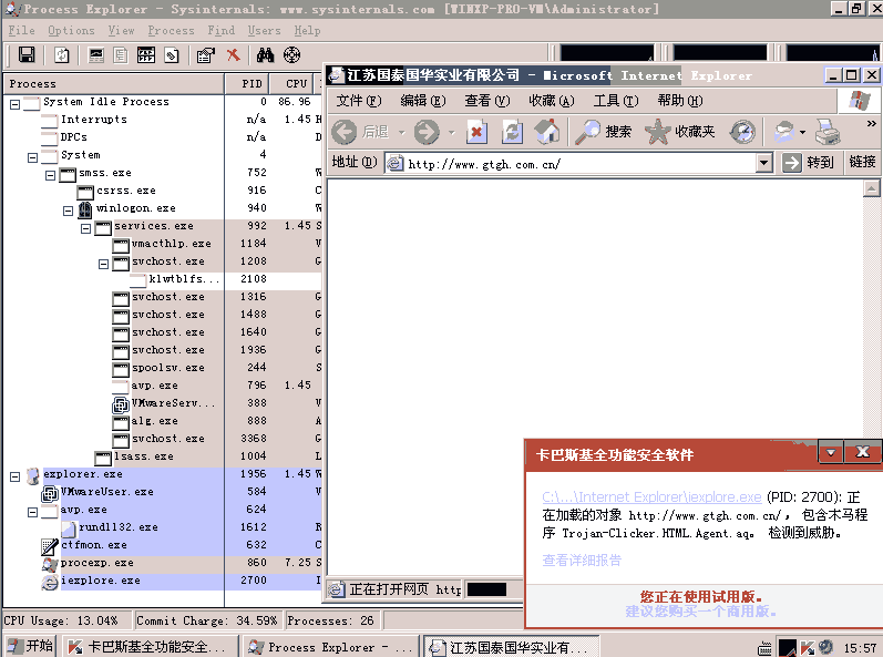 卡巴:网页打开得非常缓慢,最终可以打开;杀毒软件检测到威胁并拦截;没有病毒进程产生;CPU占用稍高。