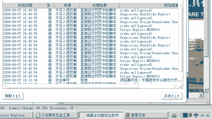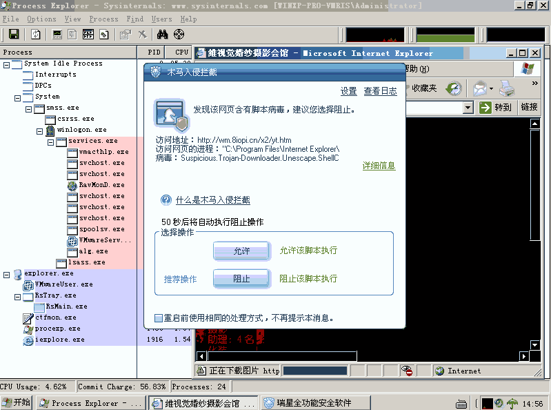 http://bbs.ikaka.com/showtopic-8663130.aspx#9951980瑞星:网页打开非常缓慢;杀毒软件的木马入侵拦截功能检测到恶意脚本并加以拦截;没有病毒进程产生;CPU及内存占用较高。