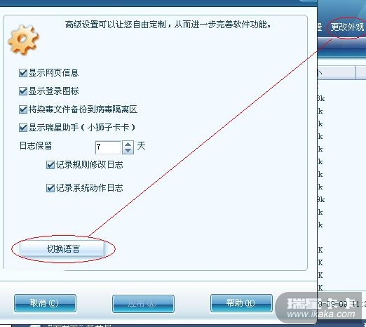 不过我倒是建议语言类切换是符合外观项目类,不是软件主要功能性的模块,大可以和“更改外观”整合下,用户在切换外观视觉效果的同时,语言也可以切换,而且大多数情况是使用的瑞星的默认用户配置,没必要为了一次语言进一次高级设置。