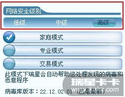 问题现象:在瑞星主界面的“网络安全级别”模块中“低级”、“中级”和“高级”所适用的网络环境,不管是在界面上的鼠标悬停,还是在帮助中均找不到相应介绍。这给菜鸟用户或新用户设置瑞星2010带来麻烦。