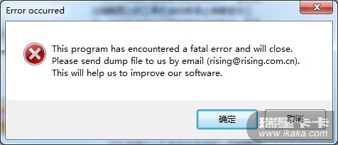 第一次启动瑞星主程序关闭的时候,出现一个错误窗口,见附图。