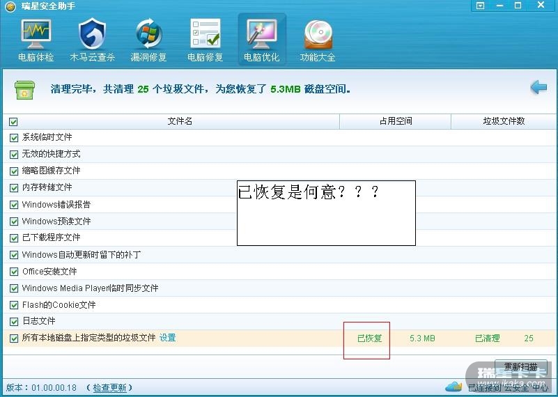 如图所示,意思是清理了垃圾文件后已恢复5.3M硬盘空间