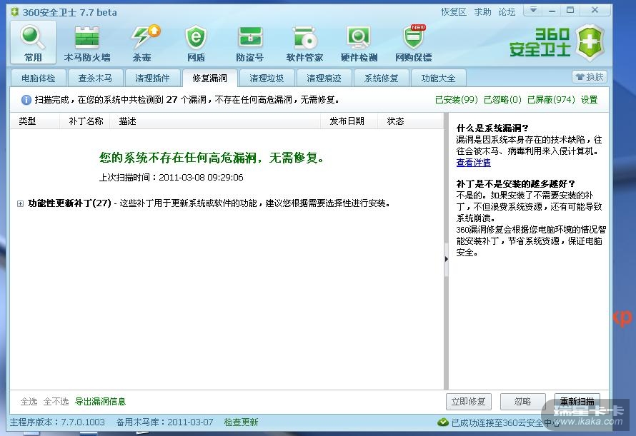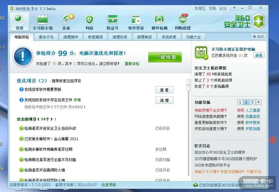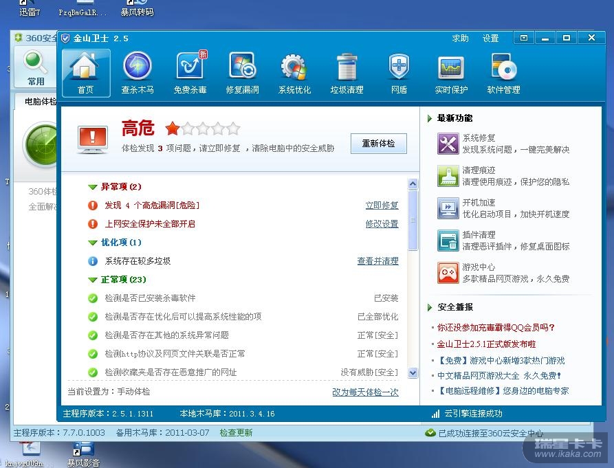 已上是3 6 0、金山卫士、卡卡对我自己电脑的检测结果(只是一般的检测,绝非评测,),也就是今天刚刚进行的