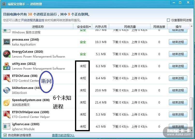 结果:异常- 联网时 所有进程都显示 安全的 ,但一断网 总会有许多进程显示未知