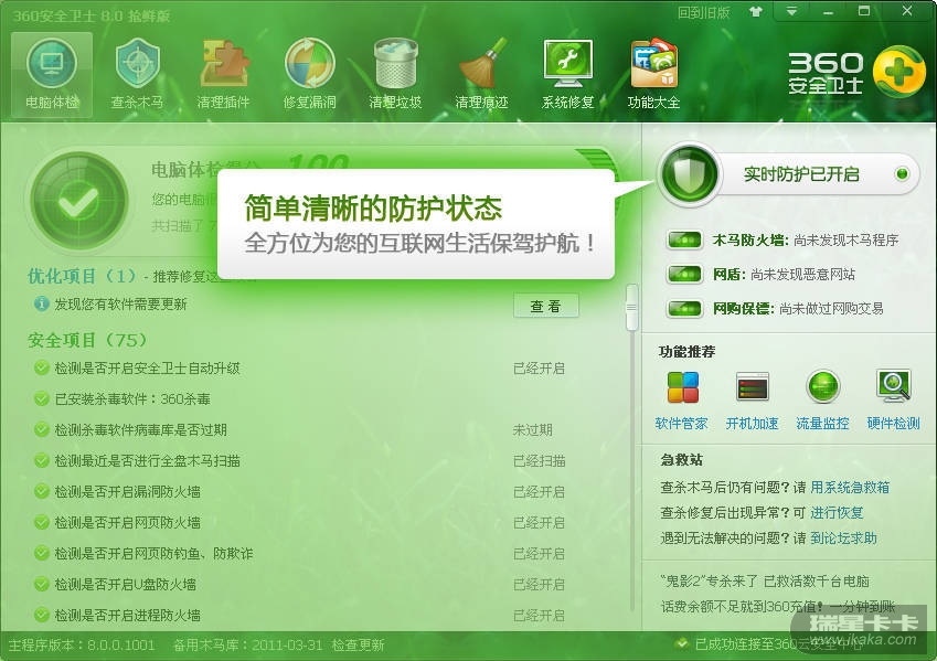 健康指示条会动态显示电脑的安全状态,大家要让健康指示条处在饱满状态哦~