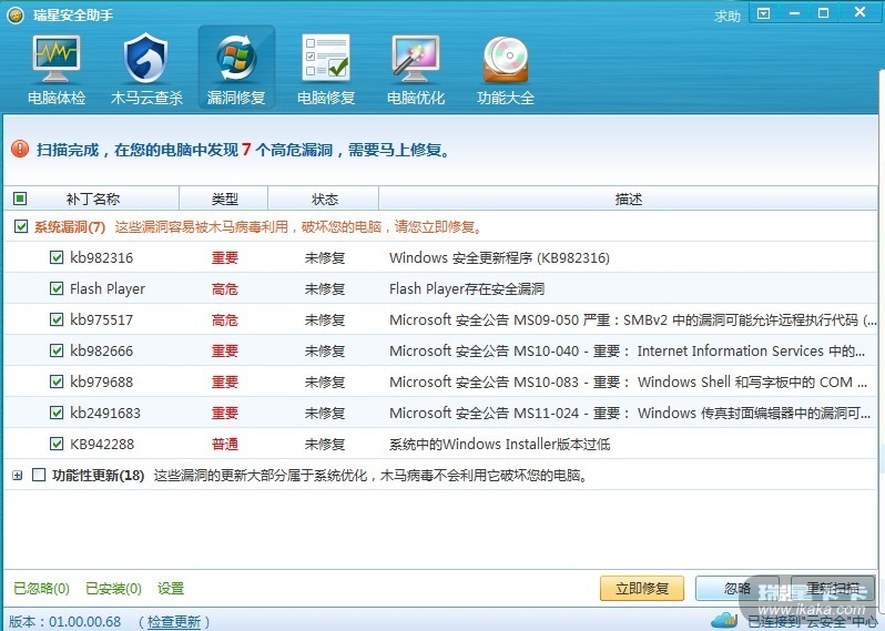 请楼主提供您的系统版本号,卡卡助手版本号以及扫描出的6个漏洞标号及截图。