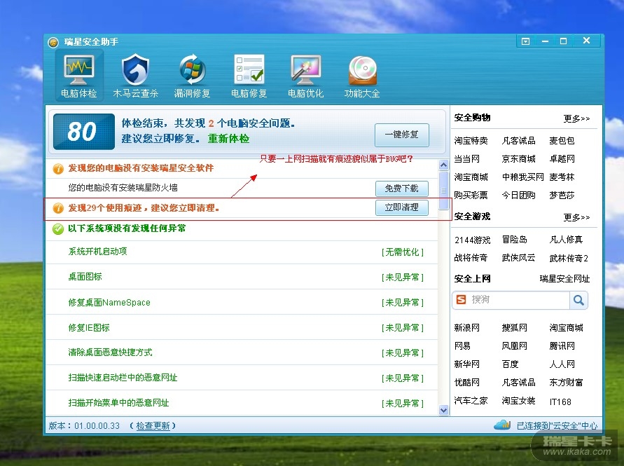 在进行上网的时候计算机中就会产生上网痕迹。关于体检提示需要清理的建议已收集反馈!感谢您参加瑞星安全助手公测活动!