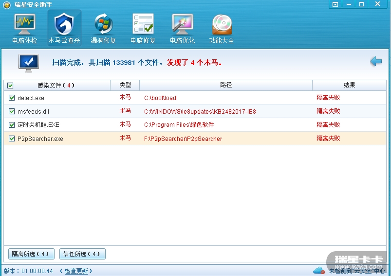 瑞星安全助手查杀出来的,隔离不了啊.....