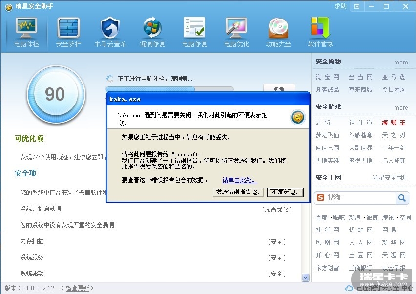 重启之后体检,提示kaka.exe遇到问题需要关闭,然后重新体检又会没问题。
