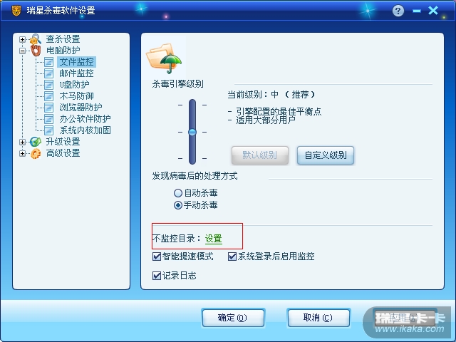 刚才我试了下,的确可以在文件监控中设置不监控文件,谢谢,不过还是希望瑞星在自定义查杀中也能设置排除目录及文件