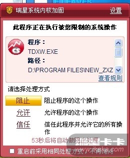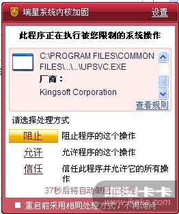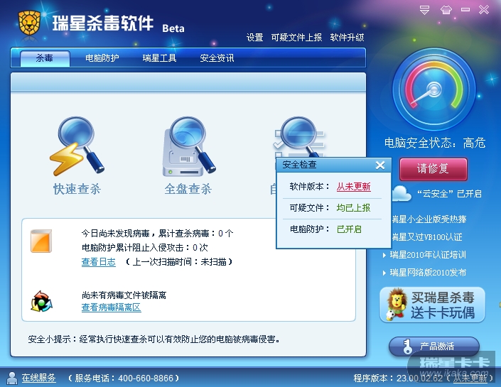 2.现在很多杀软都开始做兼容模式,希望瑞星在这方面也有些进展。瑞星弹出UI的时候,在双杀软系统中,有一会好卡!