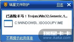 今天在玩游戏时发现搜狗拼音无法使用,本以为重新启动一下电脑就好了,因为昨天晚上还在使用,而当我重新启动完,还是一样不能使用,没办法,再下载一个重新安装一下,在安装过程中瑞星弹出如下窗口: