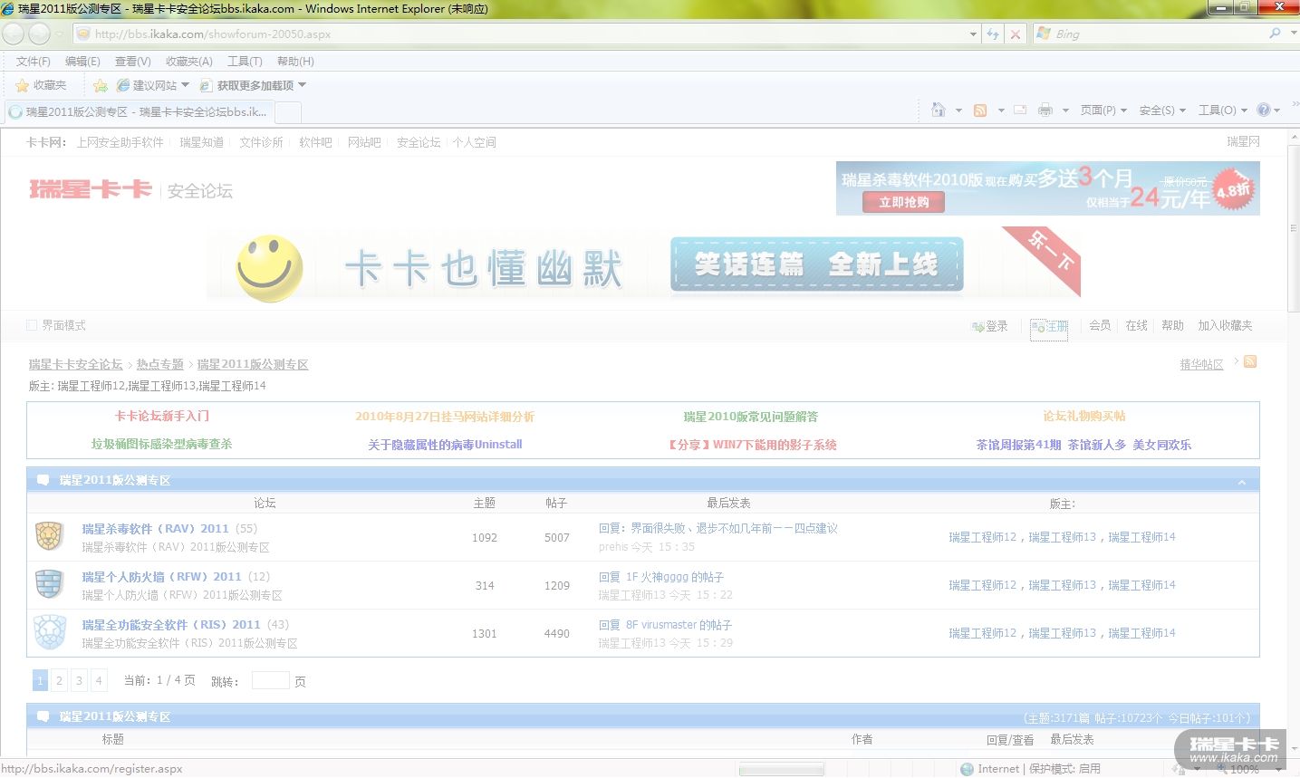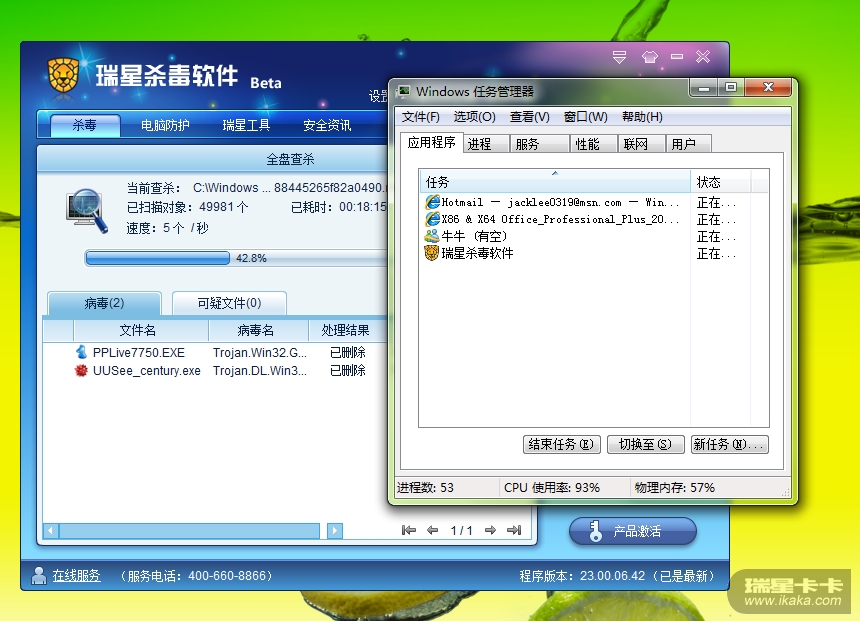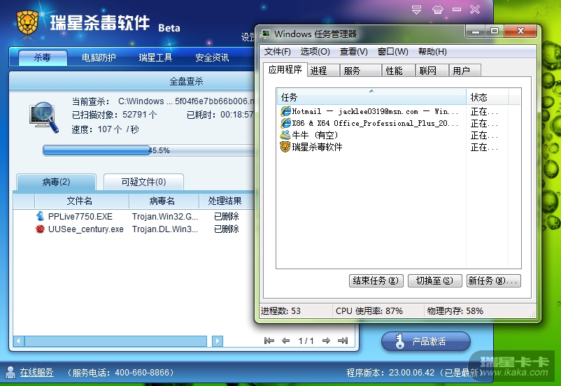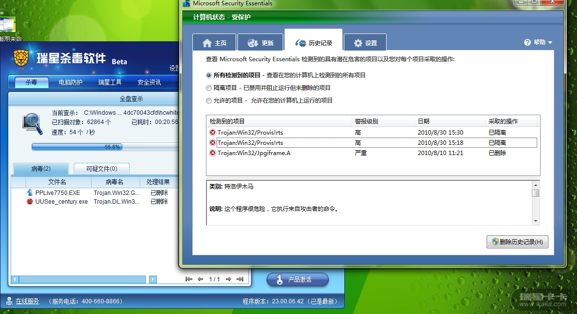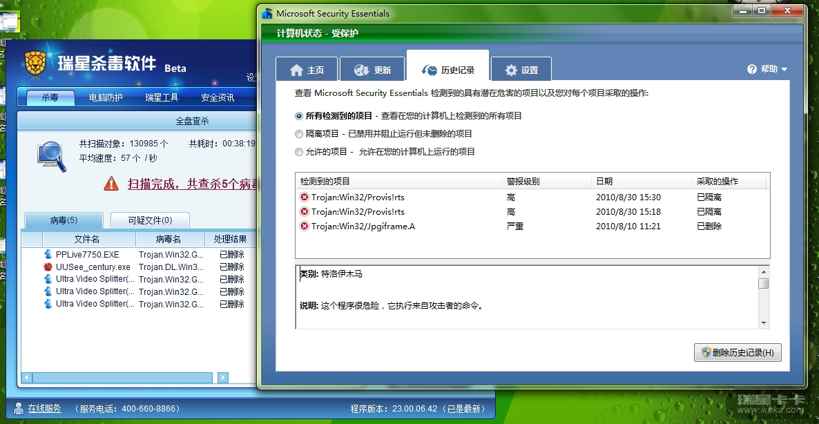 测试平台:win7 32位 ,IE8 ,通过体验不知道是杀毒能力提高还是误杀,如图,在新版瑞星中杀出了几个微软杀毒软件没查到的,但是同样微软的杀毒软件查到了,新版瑞星却没查到?不知是何原因;第二,在微软杀毒软件和瑞星并存的情况下,出现假死现象,表现在浏览器打开超慢(如图),杀毒时占用内存和cpu太大,有时候能达到92%cpu,瑞星版本号如图所示