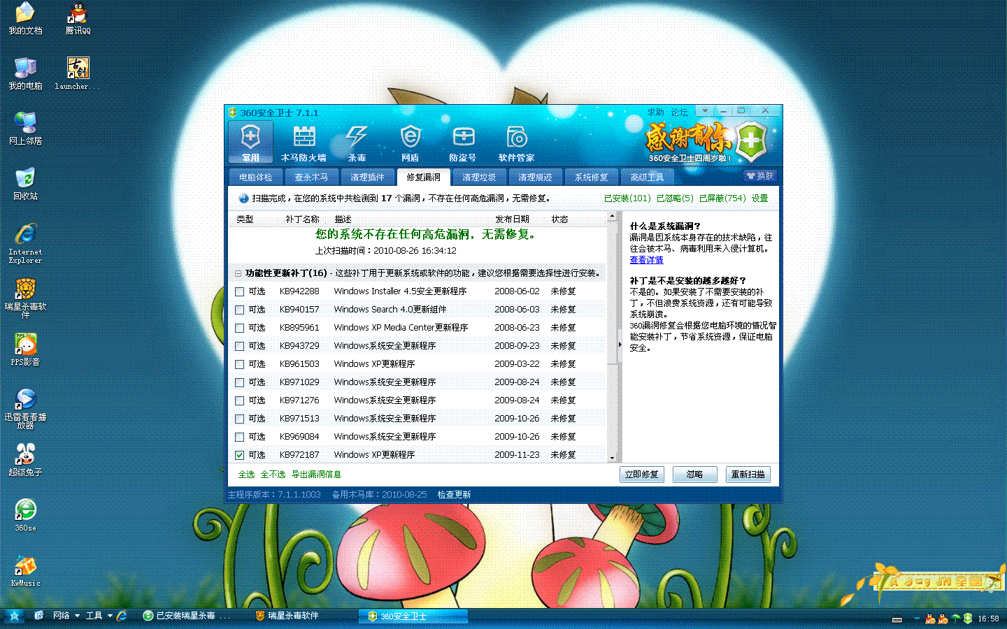 操作系统及补丁情况:XP系统 360扫描 提示无系统补丁需(见附件)