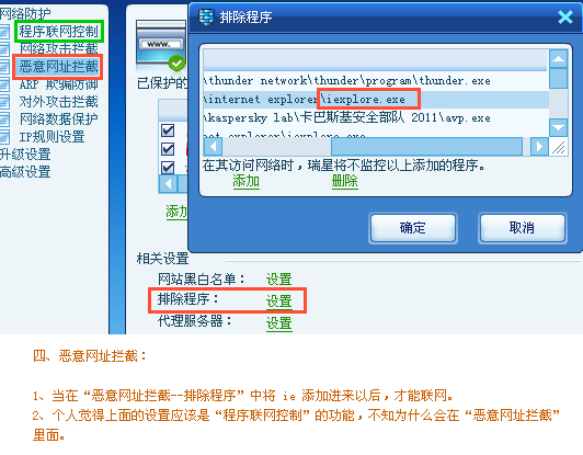 四、恶意网址拦截:1、当在“恶意网址拦截--排除程序”中将 ie 添加进来以后,才能联网。