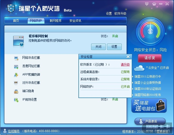 瑞星软件版本: 防火墙