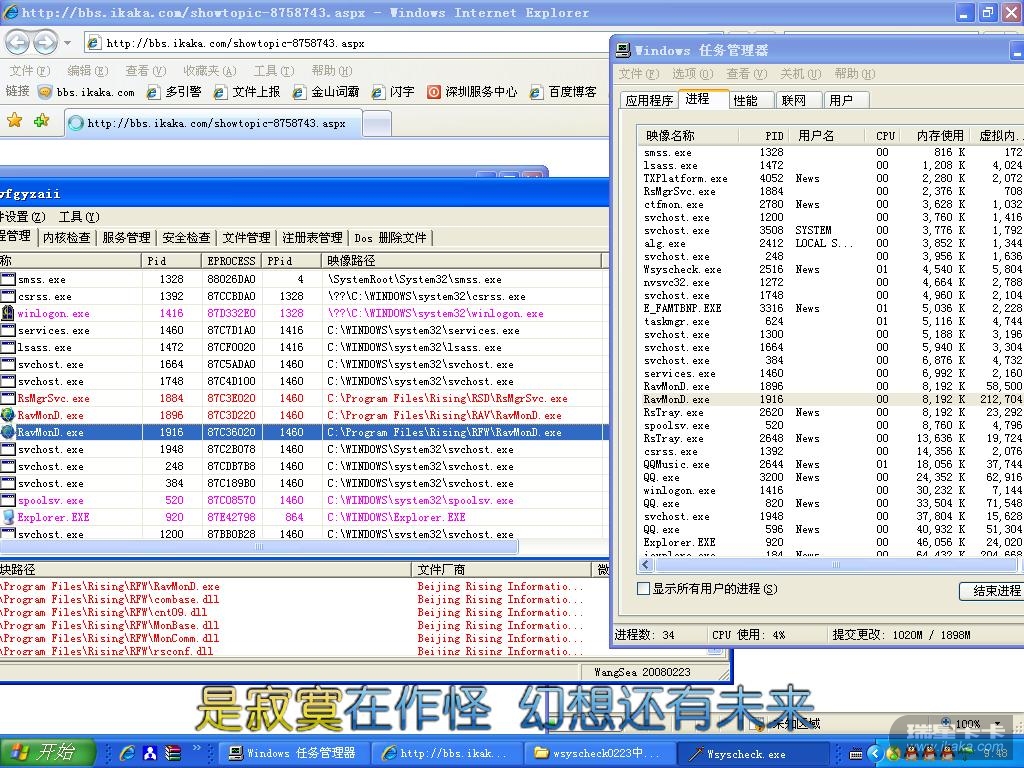 然后刚刚上卡卡的时候网页无法打开,并且系统反应速度很慢。打开任务管理器,发现RFW的RAVMOND.exe虽然只占8M物理内存,但是又占了200多M的虚拟内存。