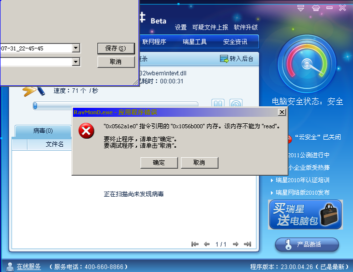 现象:2010版还可以对具体程序作系统动作的设置处理,为什么在2011版就没有了呢?强烈建议2011版增加这个,不管是杀毒软件还是防火墙还是全功能版,都增加这个,不然频繁的系统加固提示很烦人的;一个2011运行过程中的错误提示截图(我不知道那个dump file是什么)