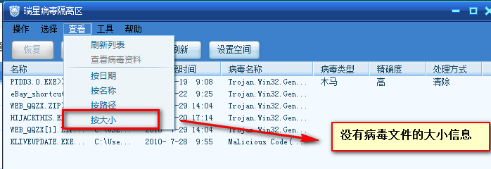 [意见建议] No10.病毒隔离区中的“大小(字节)”没了。原来的2010的隔离区是有的。