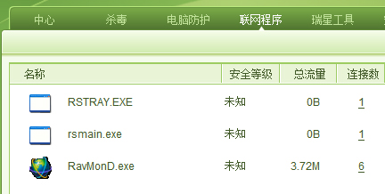1、联网程序中,瑞星自身的进程显示安全未知,如图