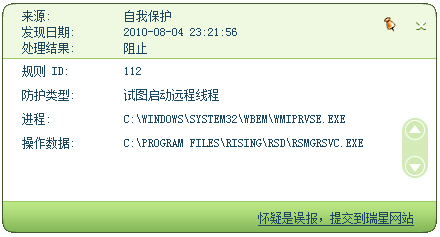 3、关闭主面板时,有提示:有阻碍瑞星运行的程序,但在日志中看数据源却是软件本身,就像乌龙。如图