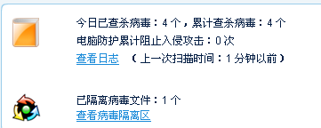 一个细节问题,每次快速扫描发现了那个可疑文件后,点“完成扫描,清除病毒”,返回杀毒页面,己查杀病毒数和累积查杀病毒数统计是正确的,但是此时如果点到“中心”页,那个柱状图的统计却没有刷新。
