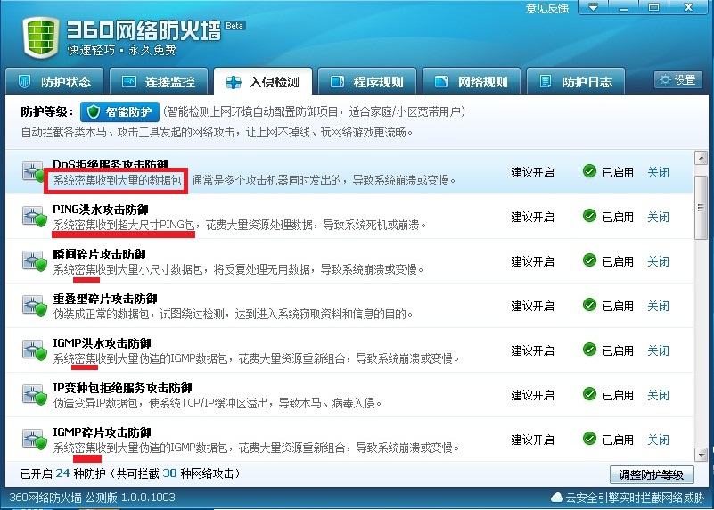 360的策略就是 系统 瞬时 收到大量的包,有可能消耗大量的资源时,拦截并报警!!!