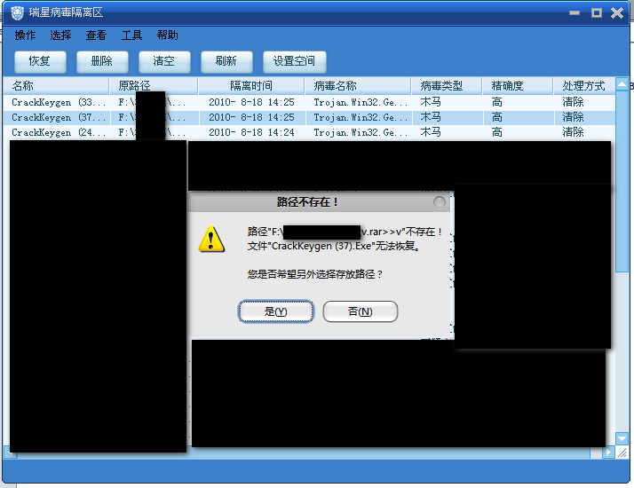 问题现象: 如题,可以将文件从压缩包中清除,但却无法从隔离区中恢复(如图)……