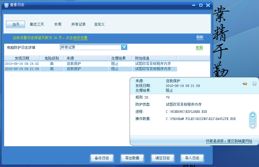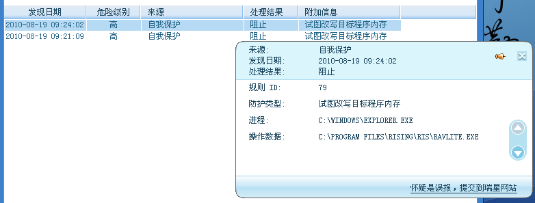 http://bbs.ikaka.com/showtopic-8755748.aspx,不同之处为现在的RIS版本为23.00.05.82。现在可以确定每次启动windows后的第一次扫描一定会出现这个问题。新发现即在日志中可以看到自我保护为ravlite拦过explorer。