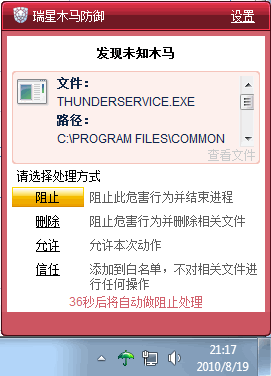 瑞星软件版本: 23.00.05.89涉及的其它软件版本: 迅雷 5.9.19.1390问题现象: