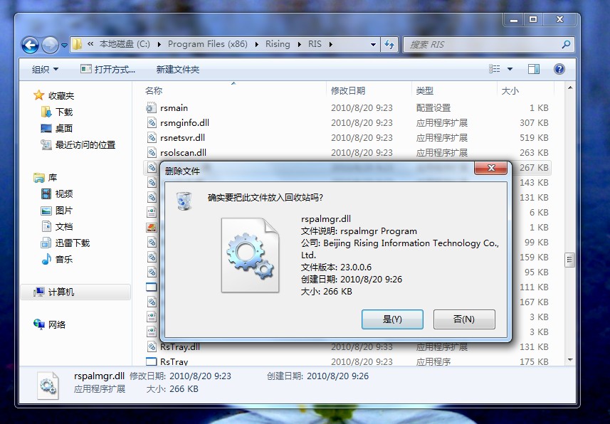 我从瑞星安装目录随便找到一个文件,直接把它右键删除,结果很杯具,确实文件被删除了。没有自我保护效果。