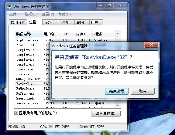 可以看出,RIS2011 Beta在Windows 7 64下没有安装目录的自我保护。下面,就开始测试进程保护。首先打开任务管理器,转到进程选项卡,尝试结束RavMonD.exe。
