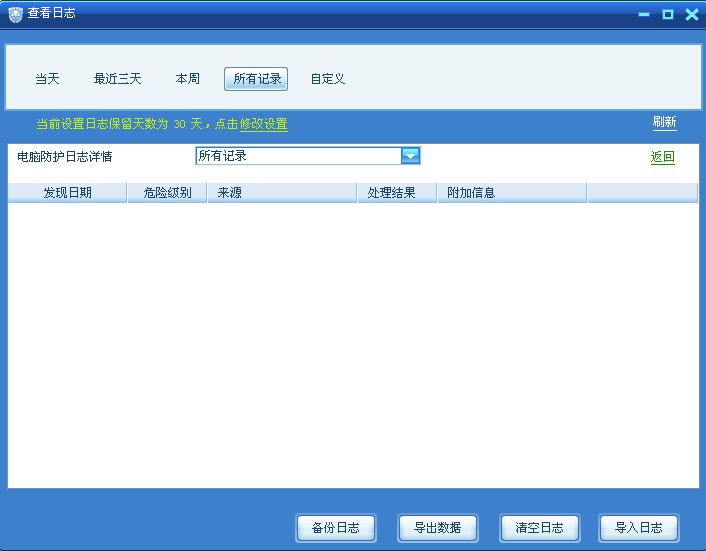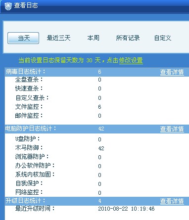在瑞星的主界面显示有“恶意程序”和“防御事件”,点击查看更多,也能显示有6项“文件监控”和42项“木马防御”,但是点击详情,却发现日志是空白的。