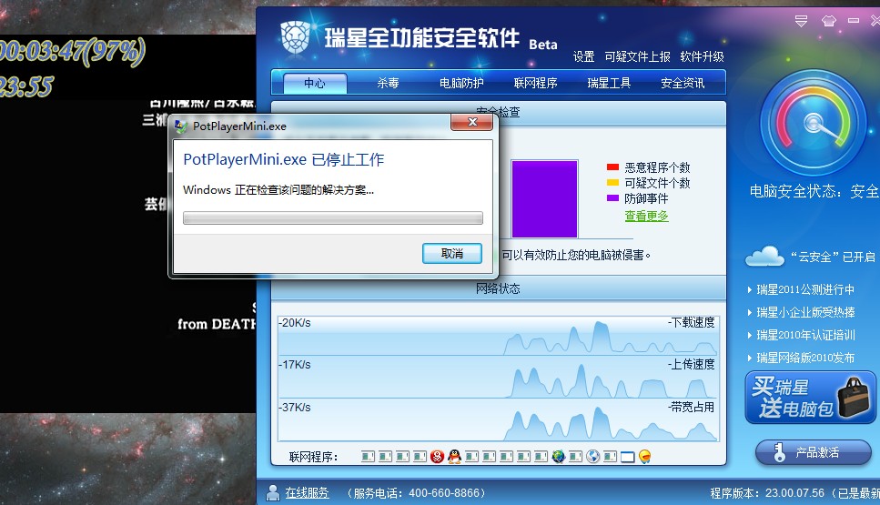出现问题前的操作步骤:打开PotPlayer播放器播放视频,再打开瑞星2011(2010版也一样),PotPlayer立即崩溃