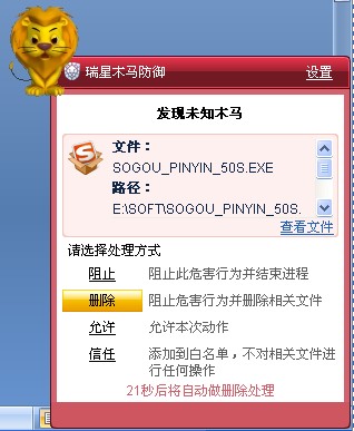 防御提示框也变漂亮了,当然这个例子是一个误杀,搜狗拼音哪能是病毒呀?