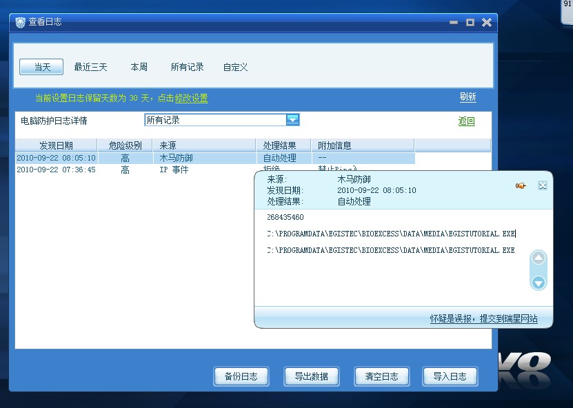 BioExcess程序跟帖打包上传,如果文件太大请上传至网盘,并提供下载地址,瑞星杀毒软件版本是多少?鼠标右键点击绿伞——查看日志——备份日志,将日志导出打包跟帖上传。