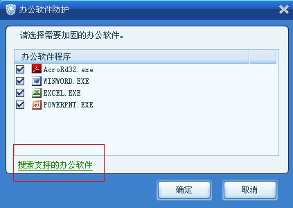 在设置办公软件防护的选项时,只要点“搜索支持的办公软件”按钮后,再立刻点确定按钮(不等搜索完成),就会出现错误提示。